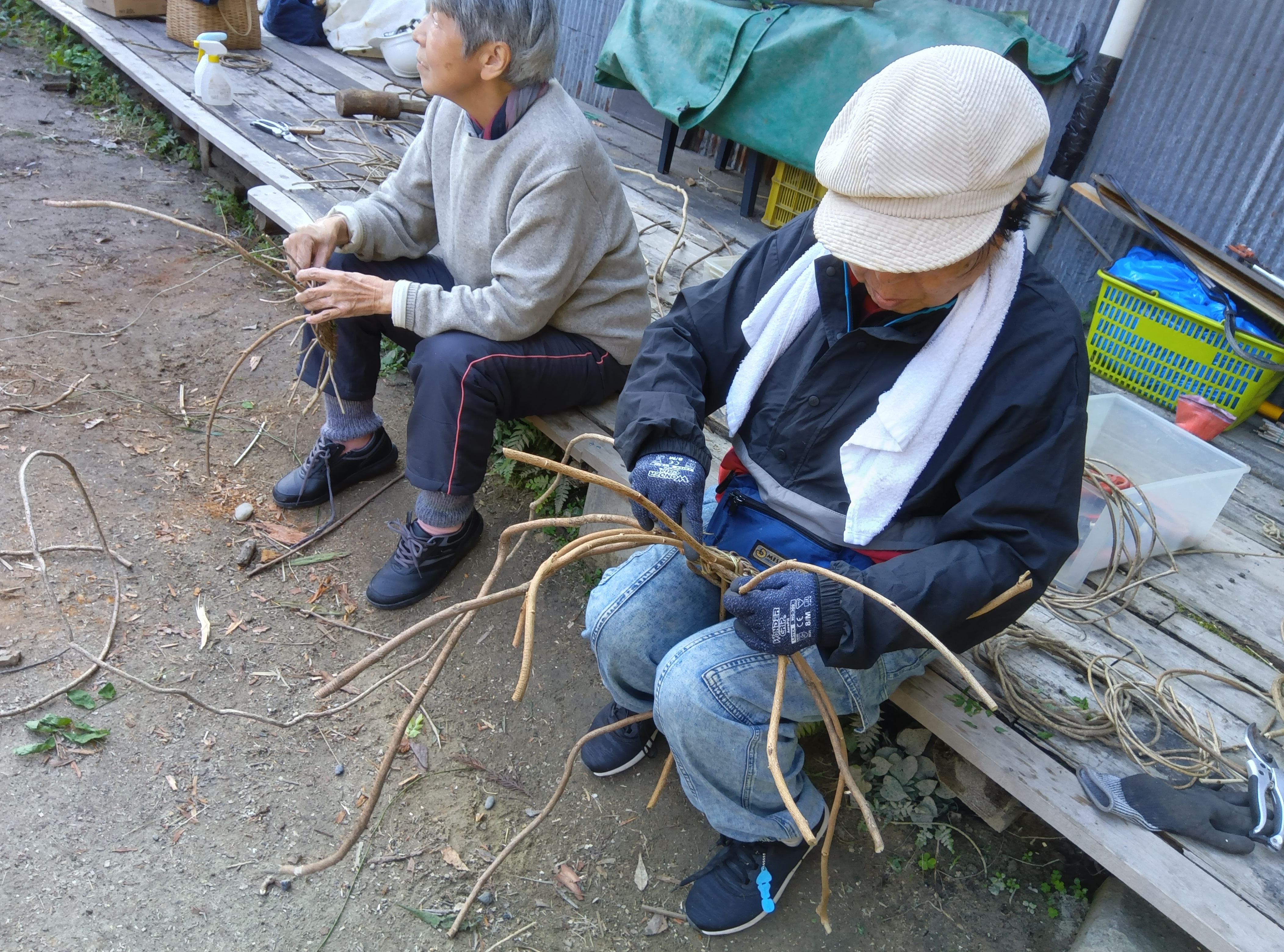 みかん小屋前の山奥から、「フジ、ミツバアケビ、アオツヅラフジ」等のつるを採取。